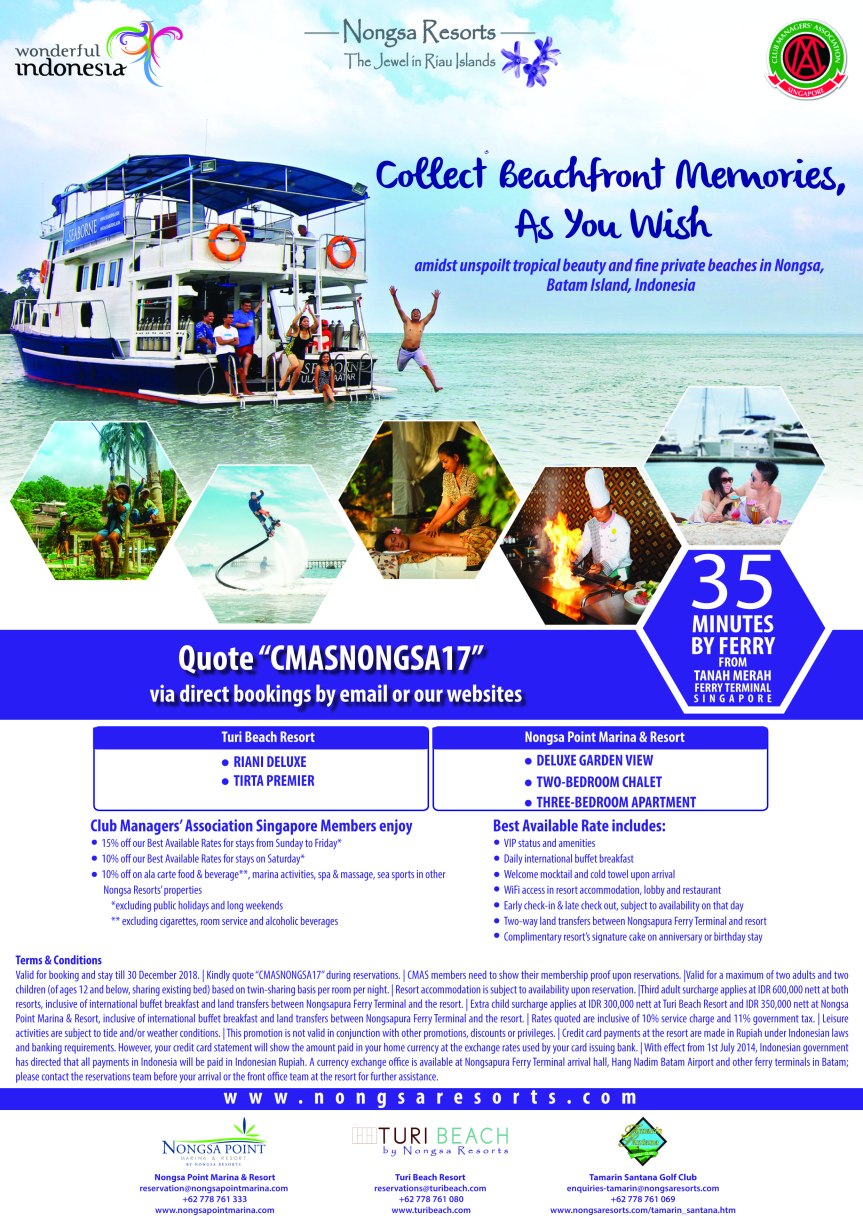 CMAS Members can enjoy below discounts at Turi Beach Resort, Nongsa Point Marina & Resort and Tamarin Santana Golf & Footgolf Club till 30 December 2018: