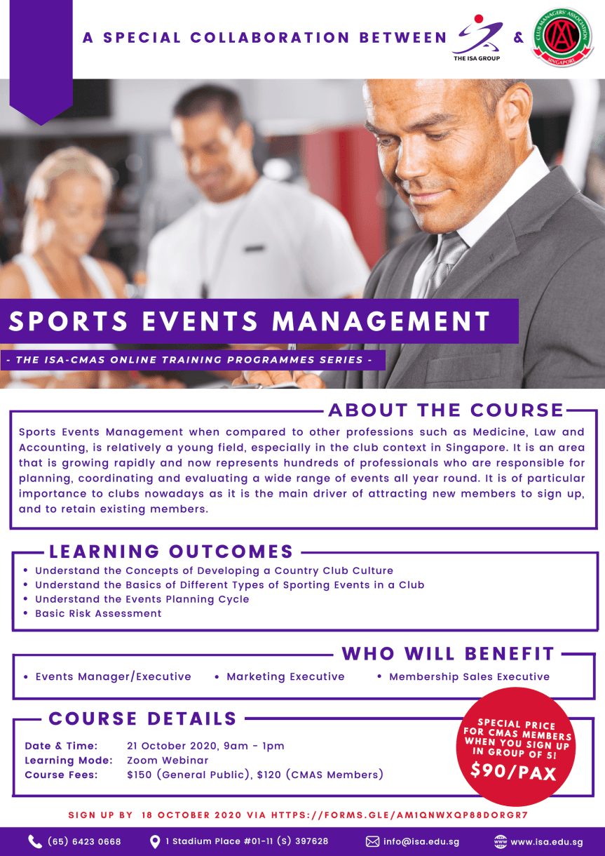 To register or for more information, visit https://www.isa.edu.sg/cmas-sports-event-management.