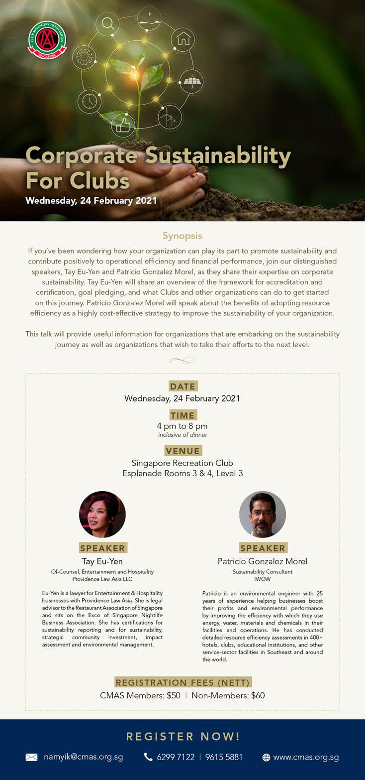 If you’ve been wondering how your organisation can play its part to promote sustainability and contribute positively to operational efficiency and financial performance, join our distinguished speakers, Tay Eu-Yen and Patricio Gonzalez Morel, as they share their expertise on corporate sustainability.